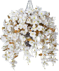 Artificial Fake Fall Hanging Flowers Plants Baskets for Outdoor Decoration, 5Pcs Faux Silk Hibiscus Long Vines in Planter UV Resistant Realistic Flower for Outside Home Porch Patio Garden, Fall White
