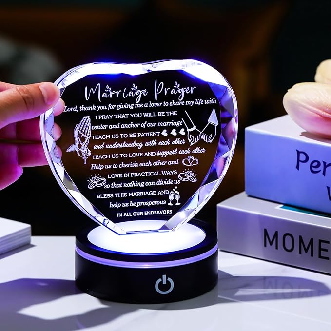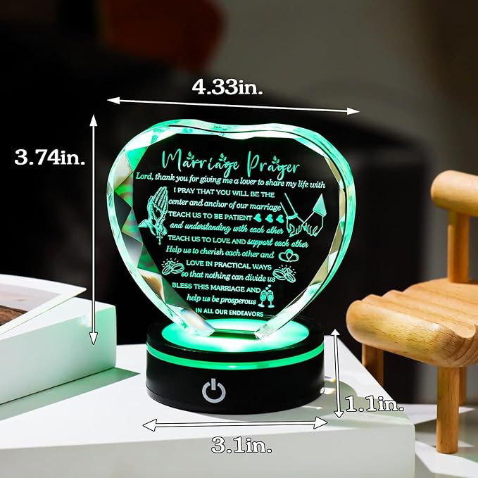 YWHL Wedding Gifts for Couples Crystal Heart Anniversary Marriage Prayer Plaque with Colorful LED Base Wedding Gift with Inspiring Quotes, Unique Newlywed Gifts Mr and Mrs Gifts Bridal Shower Gifts