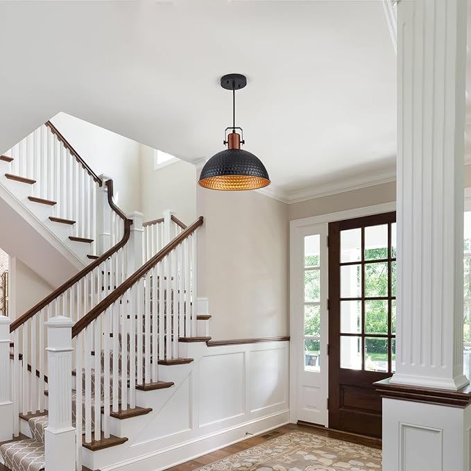 12 Inch Black Pendant Lights Hammered Matte Pendant Lights for Kitchen Island Industrial Farmhouse Adjustable Height Dome Hanging Light Fixtures for Barn, Dining Room 1 Pack