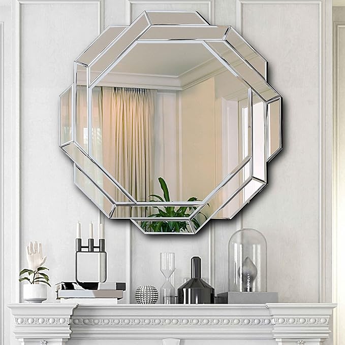 Hlartdecor Helicoid Frameless Beveled Wall Decorating Mirror (31.5X31.5inches). Silver Polished HFY Hexagon Decorative Mirror.
