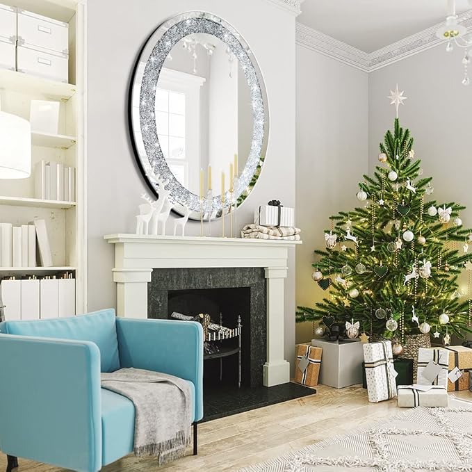DMDFIRST Crystal Crushed Diamond Oval Shaped Silver Mirror Glam Bling for Wall Decoration 24x32x0.9inch Frameless Wall Hang Sparkly Glass Mirror Stunning Stylish Fashion Home Decor Decorative Mirror