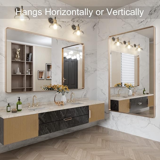 LOAAO 60”X36” Gold Bathroom Mirror, Rounded Rectangle Gold Frame Mirror, Brushed Gold Bathroom Vanity Mirror Wall-Mounted, Anti-Rust, Tempered Glass, Hangs Horizontally or Vertically