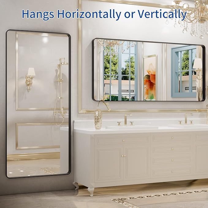 WEER Black Metal Framed Mirror, 60X28 Inch Rectangular Matte Black Wall Mirror for Bathroom, Rounded Corner Black Bathroom Vanity Mirror, Tempered Glass, Anti-Rust, Hangs Horizontal or Vertical