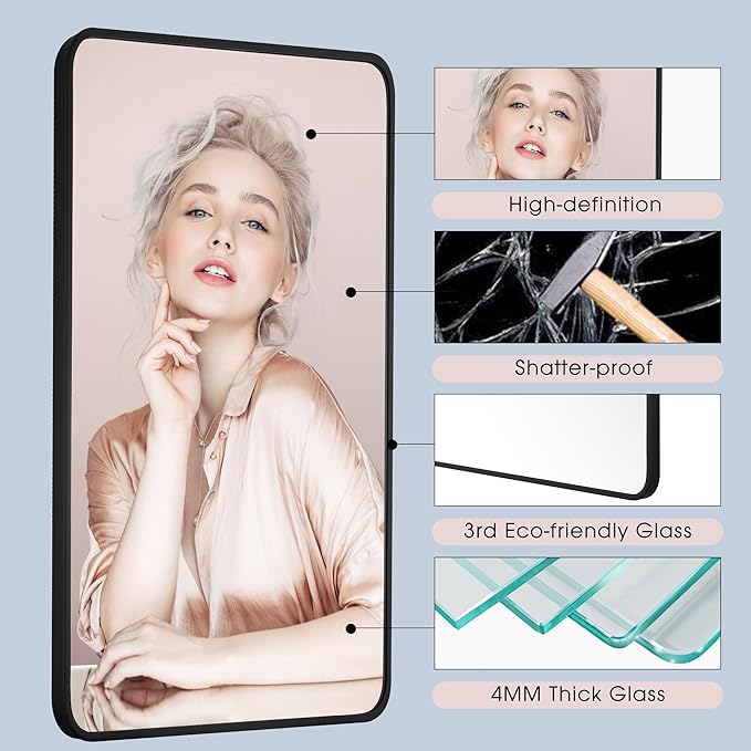 30x40 Inch Rectangle Bathroom Mirror with Black Metal Frame, Rounded Corner Rectangular Vanity Mirror for Wall, Modern Large for Bedroom, Living Room, Horizontal or Vertical