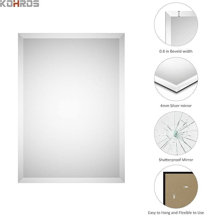 KOHROS Rectangular Wall Mirror Frameless Bathroom Mirror 18β x 24" Beveled Edge Mirror for Vanity and Entryway Hang Horizontally or Vertical