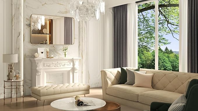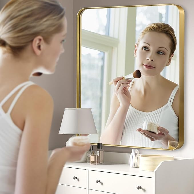 40x30 Inch Gold Bathroom Mirror, Brushed Metal Framed Rectangle Mirror with Rounded Corner, Gold Bathroom Vanity Mirror for Bedroom or Living Room, Horizontal/Vertical