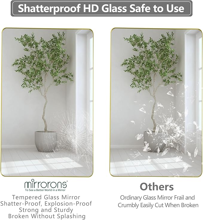 Mirrorons Gold Bathroom Mirror 36 x 30 Inch, Gold Wall Mirror, Bathroom Vanity Mirror with Rounded Corner, Shatterproof (Horizontal/Vertical)