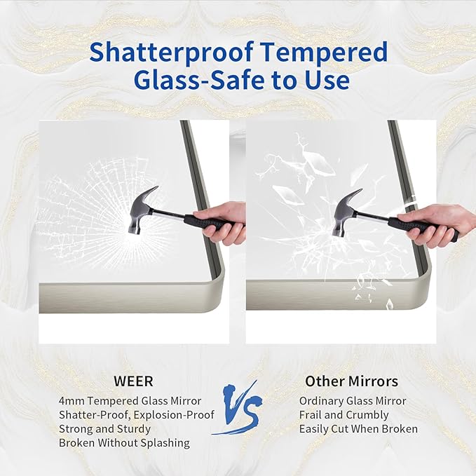 WEER 36X30 Inch Brushed Nickel Bathroom Mirror, Brushed Silver Metal Frame Mirror, Rounded Rectangle Silver Bathroom Vanity Mirror, Tempered Glass, Anti-Rust, Hangs Horizontally or Vertically