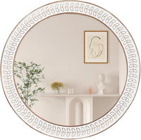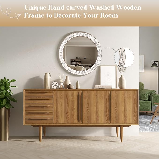 26 inch Round Mirrors for Wall Wood Circle Mirror with Carved Frame Rustic Accent Distressed Decorative for Living Room Bedroom Vanity Entryway Hallway Bathroom - White