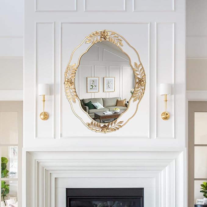 Gold Mirrors for Wall, 22"x29" Oval Metal Frame Decorative Mirror, Chic Floral Ornate Hanging Vanity Mirror for Dresser, Bathroom, Mantel,Entryway
