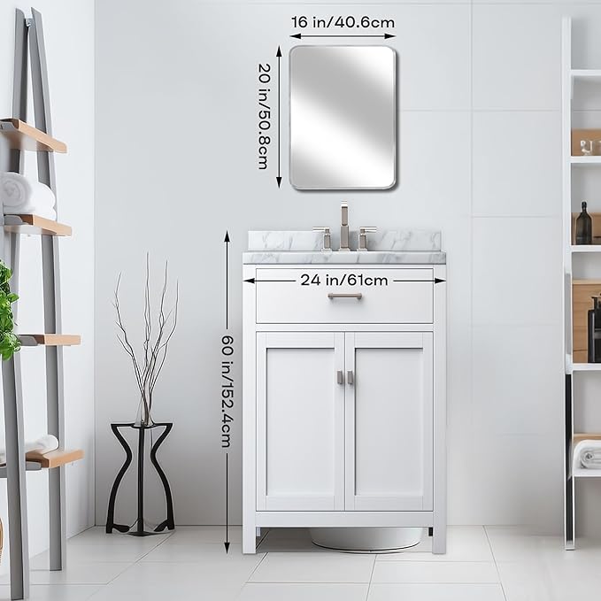 Wall Mount Mirror for Bathroom, Brush Silver Metal Framed Rounded Corner Rectangular Vanity Mirror (16" x 20", Silver)