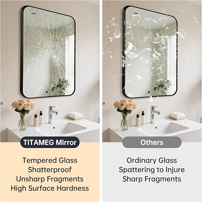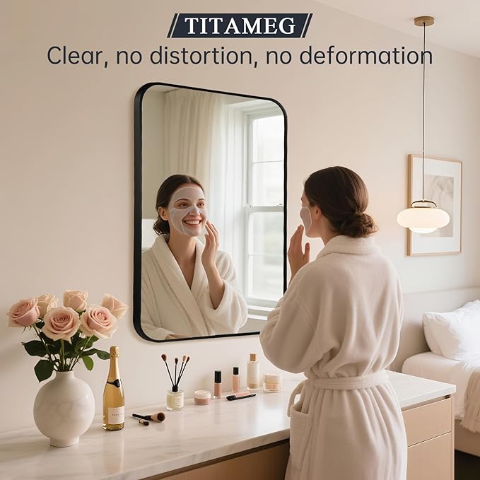 16x24 Inch Bathroom Mirror for Wall,Matte Black Framed Rectangle Mirror with Rounded Corner,Aluminum Alloy Framed Brushed Wall Mirror for Bedroom or Living Room,Vertical or Horizontal