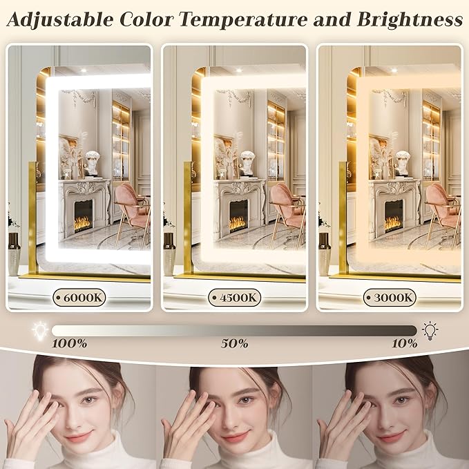 Gold Vanity Mirror with Lights - Smart Touch Dimming, 3-Color Lighting, 360° Rotatable Desktop Makeup Mirror for Desk, 22"x17"