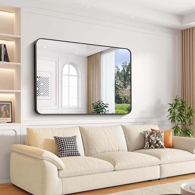 Bathroom Mirror, 55x36 inch Black Rectangle Wall Mirror, Metal Frame Rounded Corner Vanity Mirror, Large Wall Mounted Mirrors for Over Sink Bedroom Living Room Horizontal Or Vertical Mounting