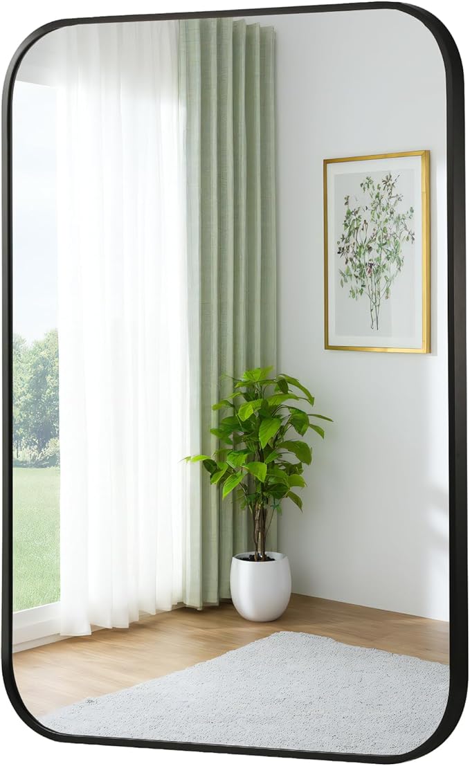 FARMER 26x38 Inch Black Bathroom Mirror, Rectangle Vanity Mirror, Brushed Mirrors for Wall, Metal Frame Hanging Mirror with Round Corner for Bedrooms, Entryways, Living Rooms, Horizontal/Vertical