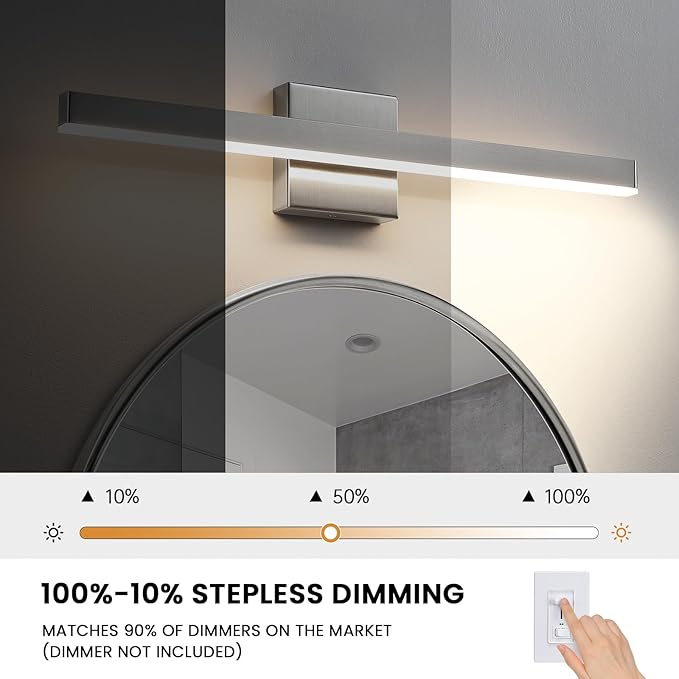 5CCT and Dimmable - 5 Color Temperature selectable(2700K, 3000K, 3500K, 4000K, 5000K), you can freely choose warm white/neutral white/cool white light by sliding the side button, to meet the needs of different usage scenarios. High color reproduction, color rendering index 90+(CRI>90Ra), truly showing the color of life. Also, the brightness of this vanity light fixture is adjustable(switch not contain in the package).
