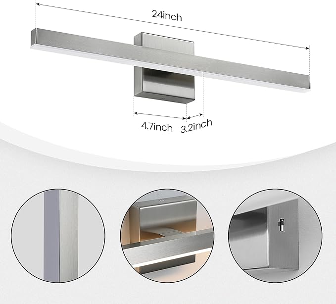 Easy and Quick Installation - Overall size: 24 inch*7.4 inch*3.2 inch. This bathroom light fixture over mirror adopts one piece design, no assembly required. Just connect to reserved wires and mount it on the wall junction box.