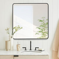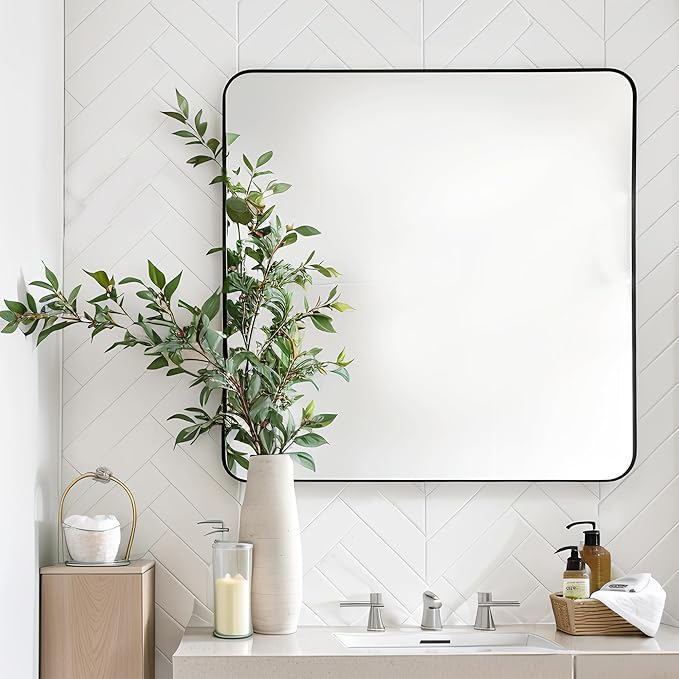 36x36 Inch Rectangle Bathroom Mirror with Black Metal Frame, Rounded Corner Rectangular Vanity Mirror for Wall, Modern Large for Bedroom, Living Room, Horizontal or Vertical