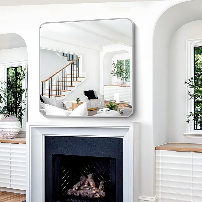 Silver Bathroom Mirror, 42 x 42 Inch Silver Square Mirror, Metal Framed Rectangular Vanity Mirror, Rounded Corner Wall Mounted Mirror for Living Room Bedroom Entryway Hangs Horizontal/Vertical