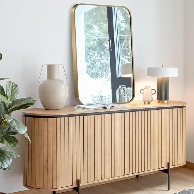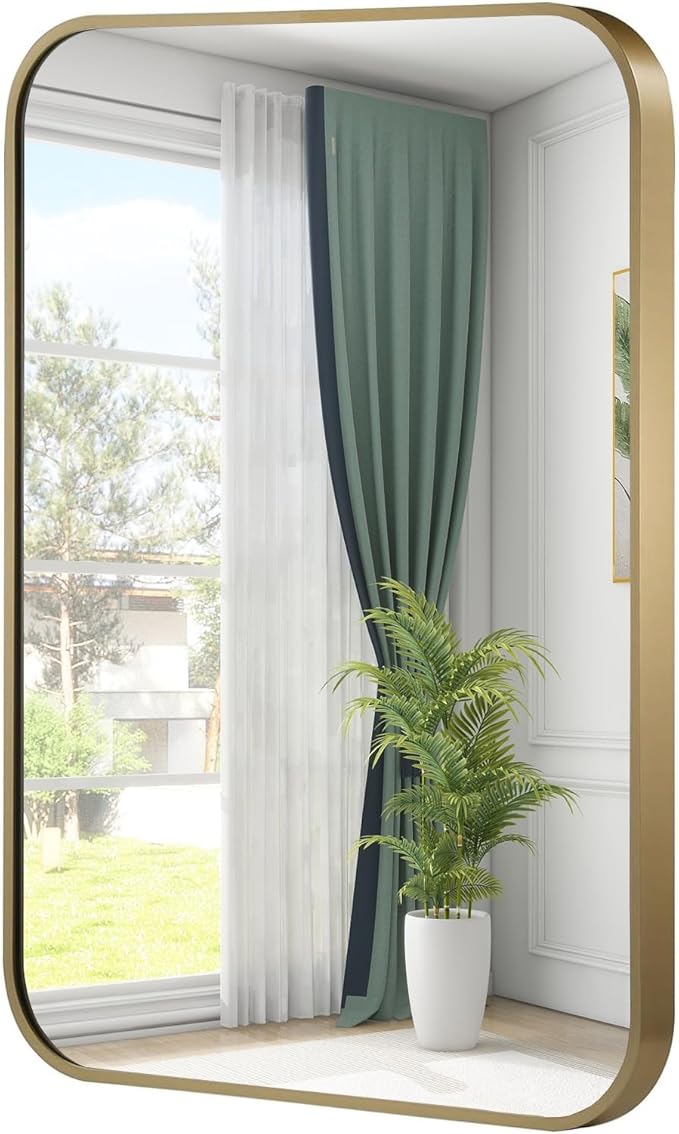 Gold Mirror, 24x36 Inch Framed Rectangle Mirror with Rounded Corner, Brushed Brass Mirror, Gold Bathroom Mirror for Over Sink, Vanity, Living Room, Bedroom, Horizontal/Vertical