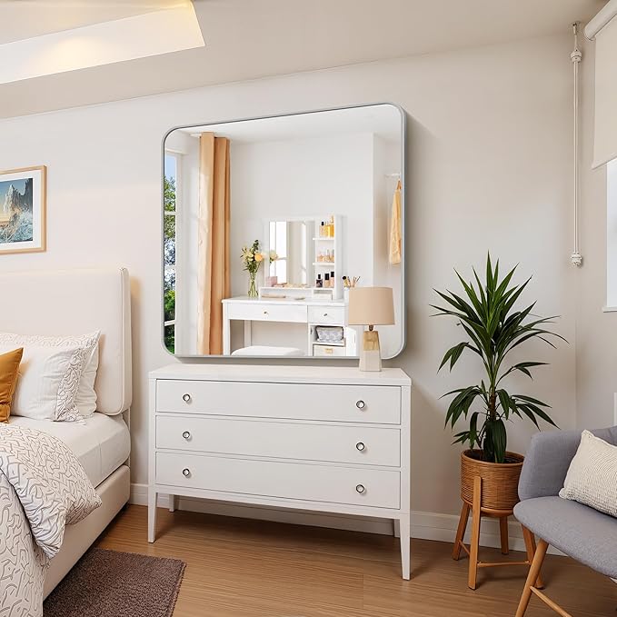 FORBATH 42x42 Inch Silver Bathroom Mirror for Over Sink, Large Square Wall Mirror with Metal Frame, Rounded Corners for Bathroom, Bedroom, Entryway Decor (Horizontal or Vertical)