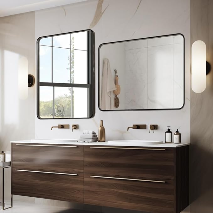 Black 24x36 Inch Metal Framed Mirror for Wall, Large Rounded Rectangle Mirror, Anti-Rust, Tempered Glass, Hangs Horizontally or Vertically