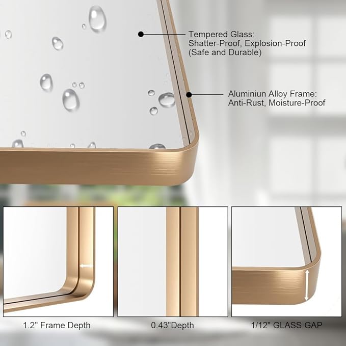Gold 40x30 Inch Metal Framed Mirror for Wall, Large Rounded Rectangle Mirror, Anti-Rust, Tempered Glass, Hangs Horizontally or Vertically