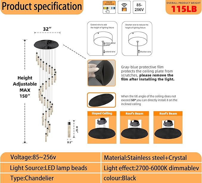 Large Crystal Chandeliers for High Ceiling H150inch Large Spiral Crystal Column Chandelier Lighting Fixture for Foyer Stair 32-Light Black