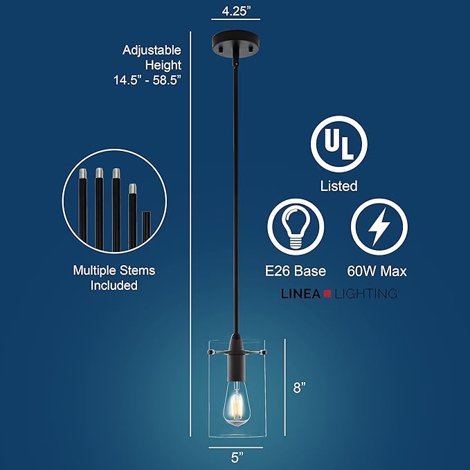 COMPATIBLE WITH MOST STANDARD MEDIUM BASE BULBS - This matte black kitchen pendant light fixture comes with medium clear glass shade that has a diameter of 5" and a height of 8"