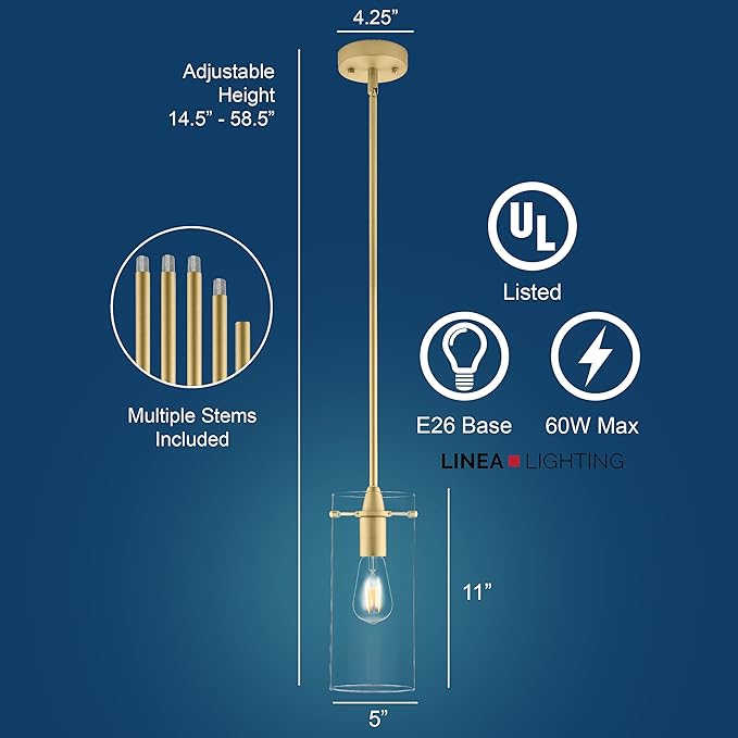 COMPATIBLE WITH MOST STANDARD MEDIUM BASE BULBS - This gold kitchen pendant light fixture comes with medium clear glass shade that has a diameter of 4.87" and a height of 11"