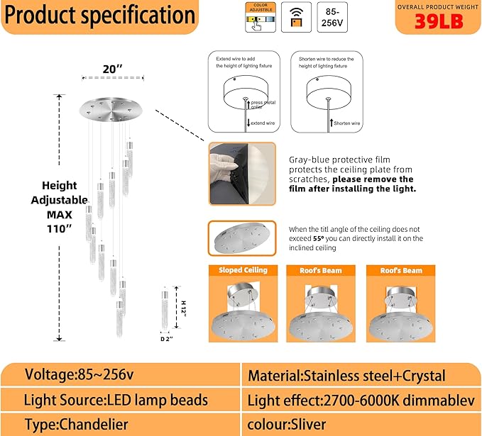 Crystal Bubble Column Chandeliers 110in Long Spiral Crystal Chandelier for High Ceiling Modern LED Foyer Ceiling Chandelier Dimmable 3000-6000K 10-Lights Silver Sale