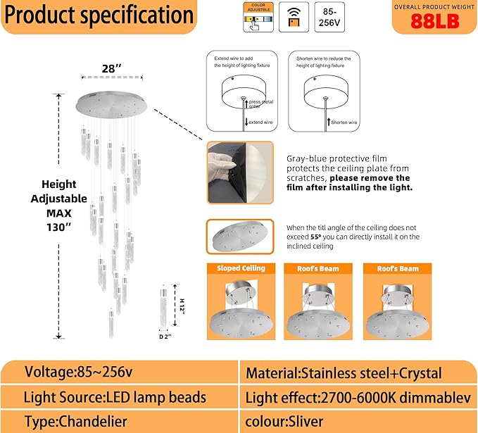 25-Light Silver Modern Crystal Raindrop Chandelier for Foyer Stair Well Entrance 130" Long Crystal Bubble Column Chandelier for Villa High Ceiling Lighting Fixtures LED Lampara, 3000k-6000K
