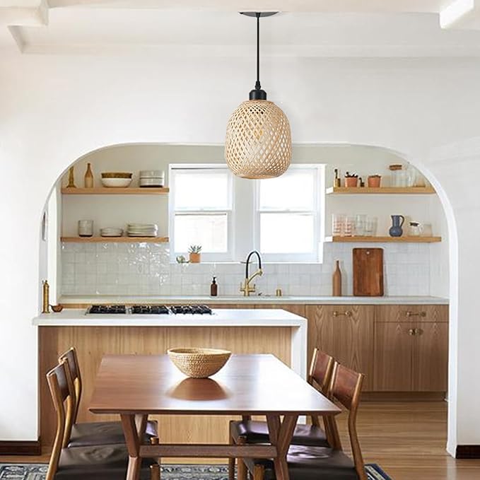 TERLEENART 1pcs Hand Woven Bamboo Boho Chic Pendant Light,Adjustable Cord Bamboo Rattan Ceiling Hanging Light for Dining Room Bar Cafe Restaurant Craft Room