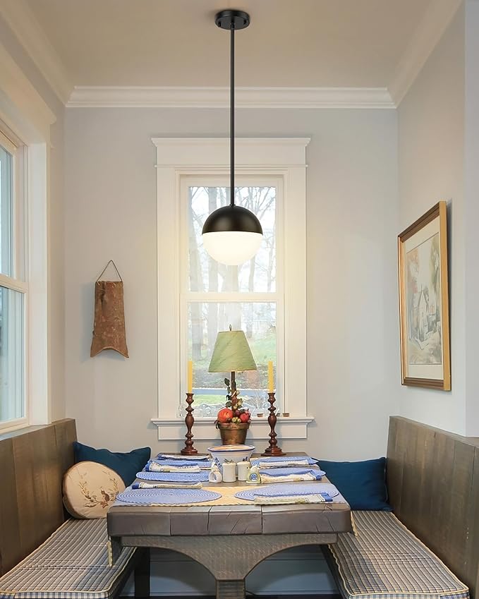 LMS 8-inch Modern Globe Pendant Light Frosted Glass with Black Finish Contemporary Mid Century Adjustable Hanging Light Fixture for Living Room Bedroom Kitchen LMS-186