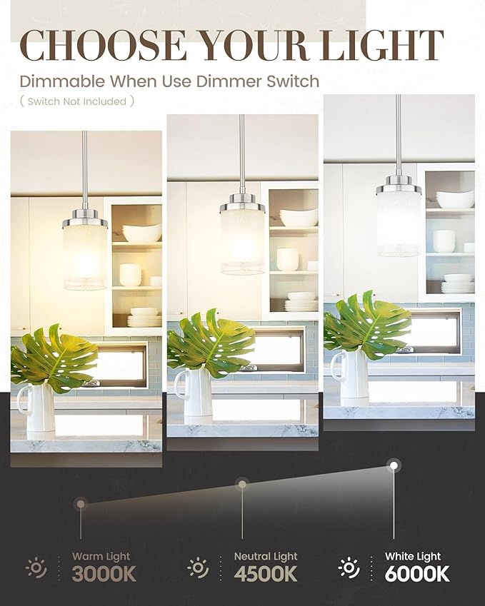 TENGXIN Modern Pendant Light for Kitchen Island, Brushed Nickel Hanging Ceiling Light Fixture,Farmhouse Pendant Lighting for Dining Room Bedroom Bar Office,TXPLBN01