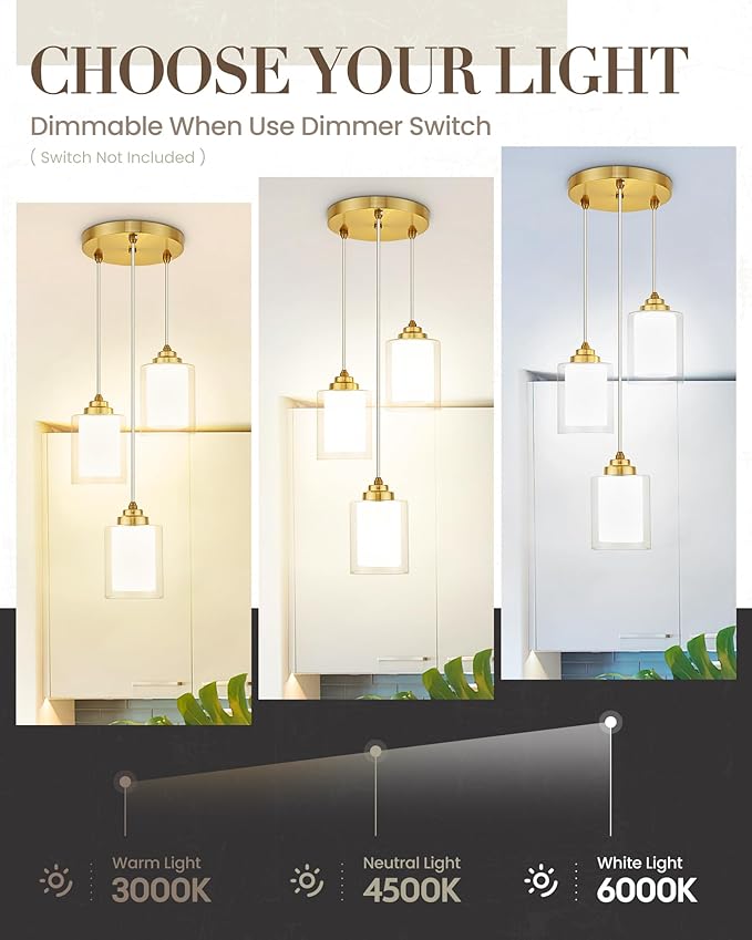 TENGXIN 3 Light Pendant Light,Brushed Gold Modern Pendant Light for Kitchen Island,Dual Glass Shade,Farmhouse Pendant Lighting for Dining Room,TXPLBG04