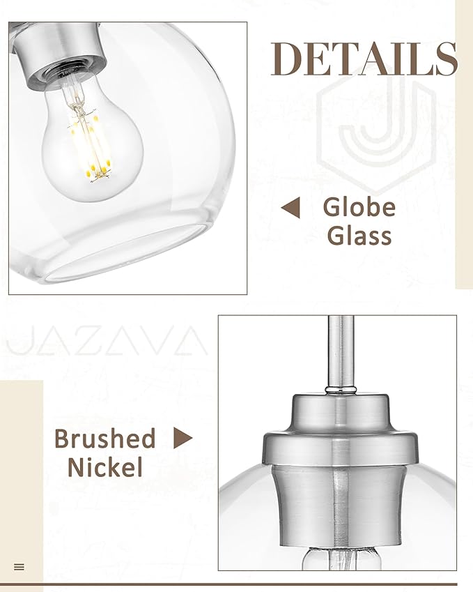 Globe Pendant Light Fixture, Modern Brushed Nickel Hanging Light with Clear Glass for Kitchen Island Dining Room Bedroom Hallway Foyer (1 Pack), PL101BN-2PK