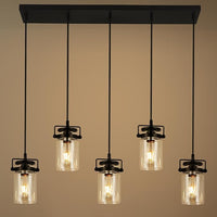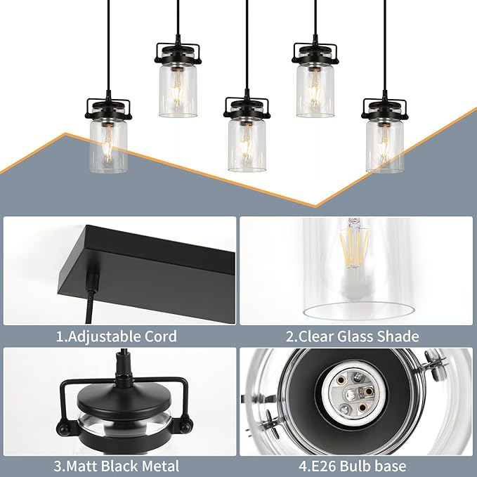 Pendant Lighting for Kitchen Island, Dining Room Light Fixture Black, 5-Light Hanging Linear Chandeliers with Clear Glass Shade Farmhouse Chandeliers for Dining Room(E26 Bulb Base)