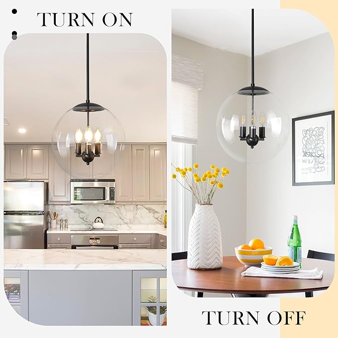 13.7" Globe Pendant Light 3-Light Black Mid Century Pendant Light Clear Glass Lights Kitchen Island Mid Century Adjustable Hanging Farmhouse Globe Fixtures for Living Room Lobby