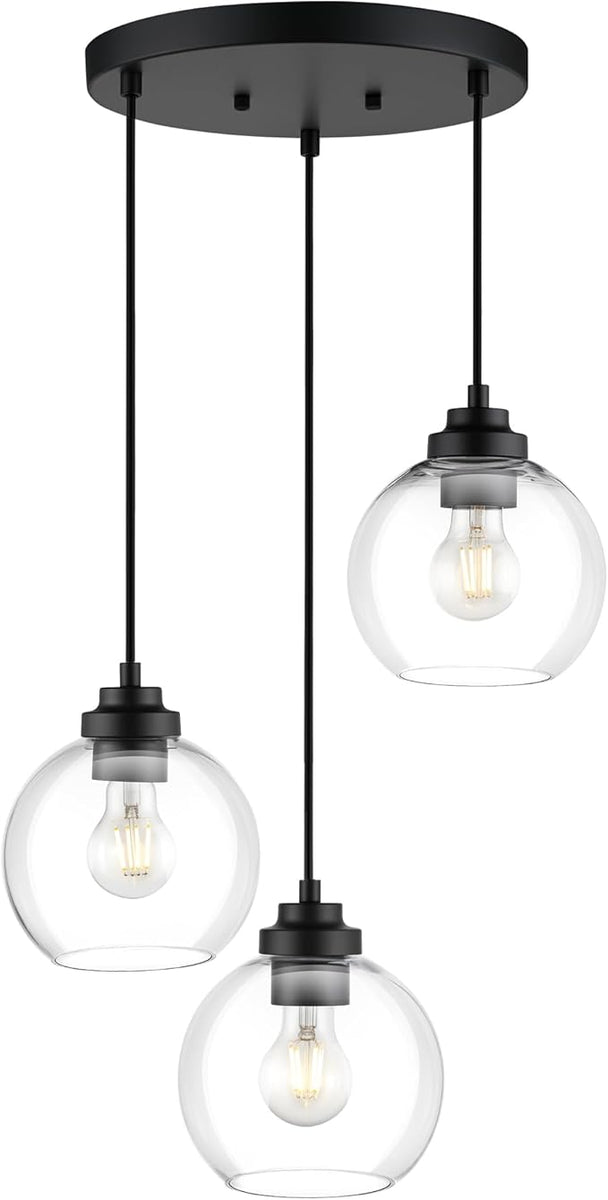3-Light Black Pendant Light Fixture, Globe Cluster Hanging Light, Kitchen Island Lighting with Clear Glass for Dining Room Living Room Laundry Entrance Foyer, ZCPL101BK-3C