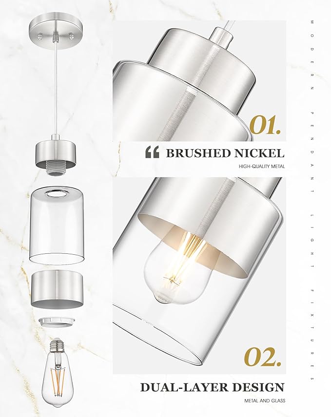 2-Pack Pendant Lights Kitchen Island, Brushed Nickel Dual Shade Hanging Lights Fixtures with Metal and Clear Glass, Kitchen Pendant Lighting Over Island for Dining Room, AD-24022-1P2-SN
