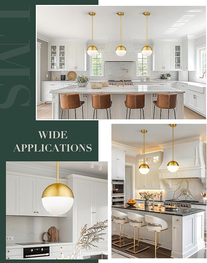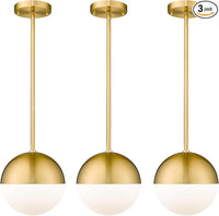 LMS 8 Inch Mid Century Pendant Lights, Brushed Gold Kitchen Island Light Fixtures with White Globe Glass Shade, Adjustable Hanging Rod, 3-Pack for Home Office Dining Room Bathroom, LMS-186BG3PK