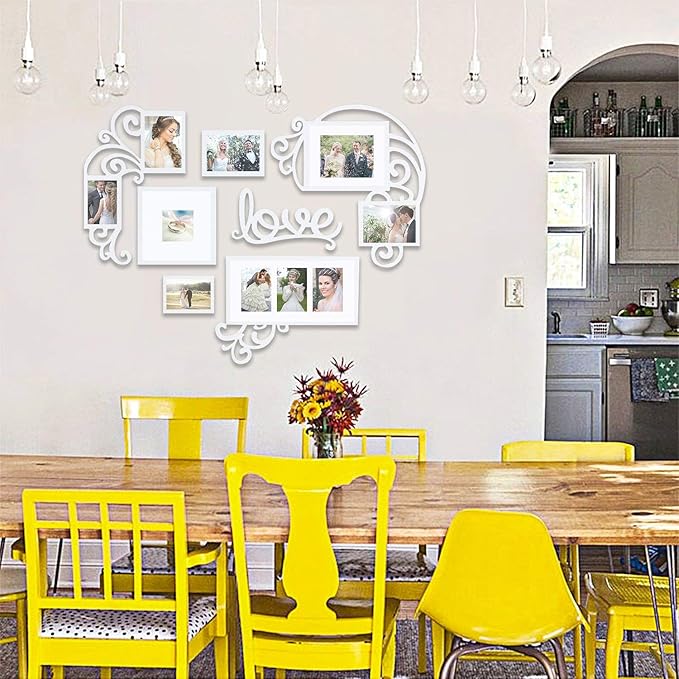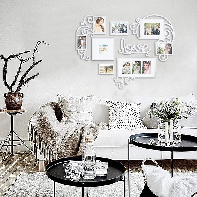 J.M.Deco Vintage Picture Frames 7 Pack in Love Shape Heart Photo College Frames, Family Lovere Valentine Picture Frames 4''x4'' / 4''x6''/ 5''x7''/ 5''x8'' Photo Frames Set | White