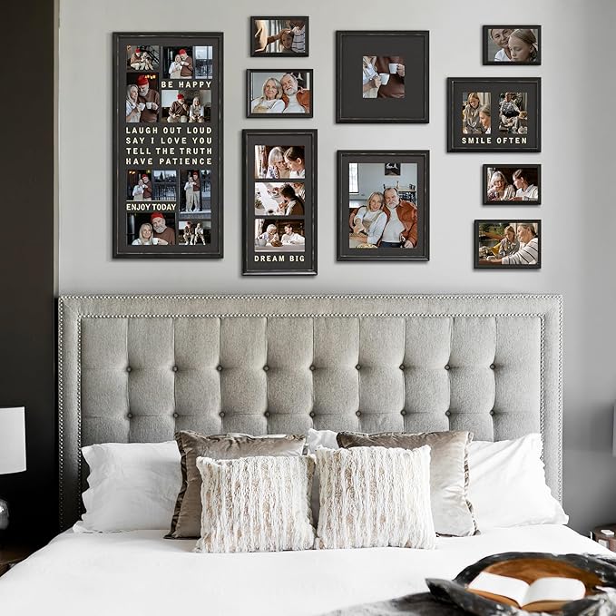 J.M.Deco 10 Pack Collage Picture Frames Set for Wall Decor 20 Slots, Multi Picture Frames Decor with with Glass Cover & Slogan for Living Room, Bedroom, DIY Wall Display, Black