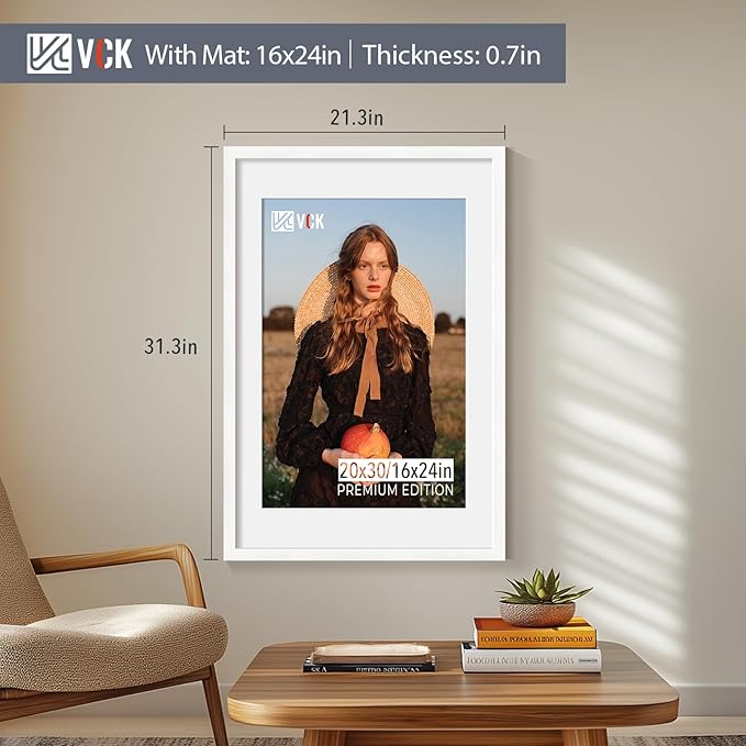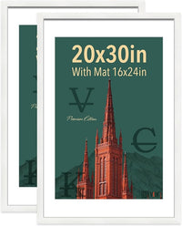 VCK 20x30 Poster Frame White - with Mat 16x24, Exclusive Textured Solid Wood Picture Frame Horizontal and Vertical Formats with Included Hanging Hardware, 2 Pack