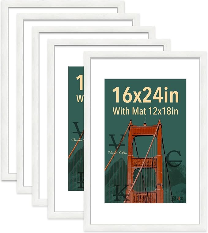 VCK 16x24 Poster Frame 5 Pack, Matted to 12x18 or 16x24 without Mat, Textured Exclusive Solid Wood Picture Frame, White