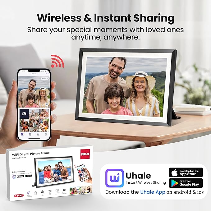 RCA 10.1” WiFi Digital Picture Frame, Electronic Photo Frames 32GB Storage, HD IPS Touch Screen WiFi Frame/Auto Rotate/Wall Mounted, Easy Setup in Uhale App to Share Photo/Video Anytime (Black)