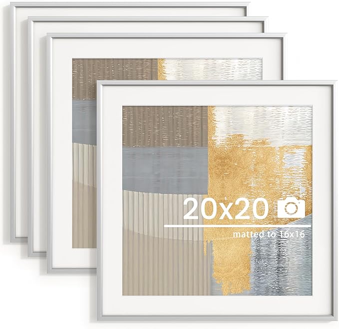 20x20 inch Metal Picture Frame - Thin Aluminum Square Photo Frames with 16x16 Removable Mat - High Definition Plexiglass - Vertical and Horizontal Display - Wall Hook Hanging Hardware Included - Silver, Set of 4