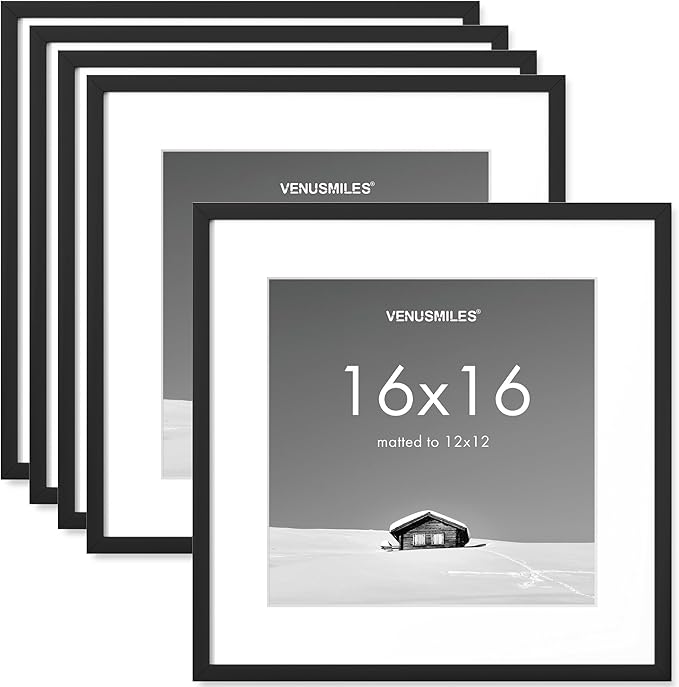 16x16 inch Picture Frame, 16x16 Photo Frames with 12x12 Removable Mat - High Definition Plexiglass - Vertical and Horizontal Display - Wall Hanging Frame - Black, 5 Pack