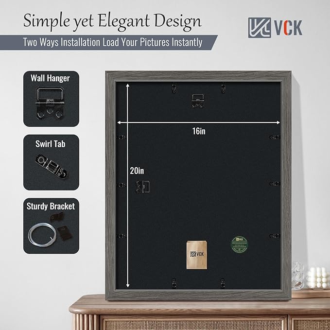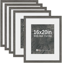 VCK 16x20 Picture Frame 5 Pack - Grey, High-End Wood Poster Frames with Tempered Glass, Display 11x14 Photo with Mat or 16x20 without Mat, Art Gallery-Quality, Wall Hanging, Grey